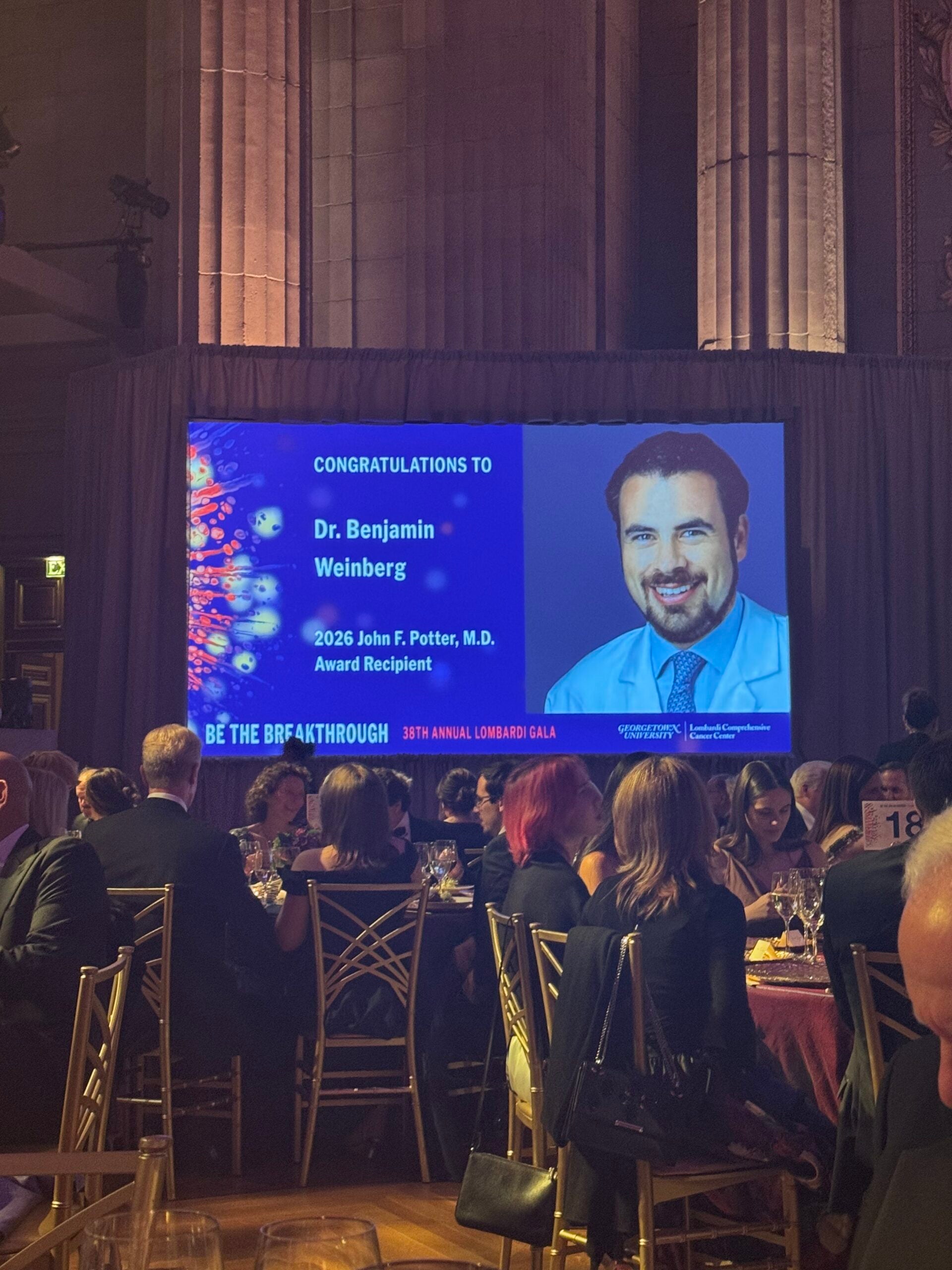 Congratulations to Benjamin Weinberg, MD, on receiving the John F. Potter, M.D., award during this month’s Lombardi Comprehensive Cancer Center Gala. This award recognizes the achievements of rising-star researchers who are moving the needle of progress forward through innovation and persistence.